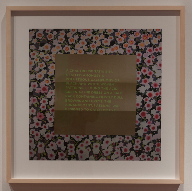 A chartreuse satin sits nestled amongst a voluptuous cacophony of black and white woven patterns. I found the acid green dress on a sale rack containing mostly dull browns and greys. The arrangement, I assume, was designed to catch my eye. After its purchase, it hung in my closet for many years, having been worn only once or twice before being tucked away. Its neighbour is a jacket whose black and white pattern fluctuates between thick and thin.