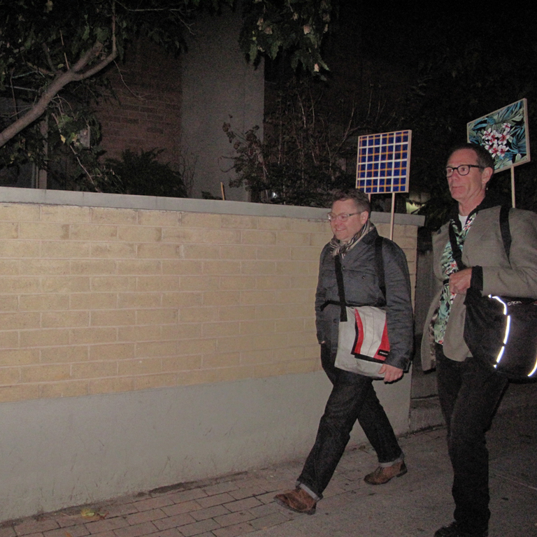 L’œuvre Sandwich Boards (For My Dearest Friends) est destinée à déplacer le regard que l’on porte sur l’inertie des choses dans une tentative ultime de rapprochement avec le spectateur. L’activité principale consistant à circuler dans les rues de Toronto, les marcheurs/porteurs, sandwichés entre deux panonceaux, colportent, au-delà des frontières institutionnelles de l’art, une gamme de reproductions peintes de textiles à motifs décoratifs – imitant fidèlement des vêtements ayant appartenu à de proches amis(es) de l’artiste. Conceptuellement1, divulguant nombre de filiations affectives qui transcendent la symbolique iconographique des imprimés géométriques, carrelés et/ou fleuris, chaque placard désigne un(e) ami(e) – absent(e) de corps, mais toujours présent(e) au travers des modalités formelles et stylistiques des étoffes peintes.