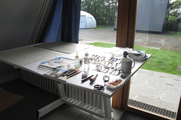I began a new project this summer at the Frans Masereel Centrum. Based on the Swiss Air Flight 111 Crash, I started a small folio of watercolor and screenprints. Entitled For September Second, they will be cased in a clamshell box when I get them finished, They may be accompanied by text panels. This folio of work is an extension of the work I am making for a solo exhibition that will be held this fall at AmoArt in Waitsburg, WA.