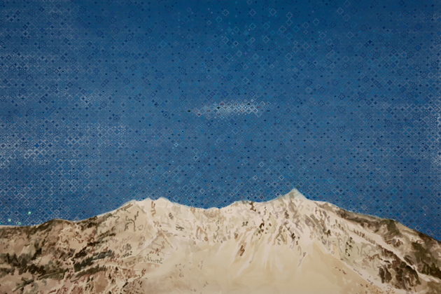 Frank Slide, Crowsnest Pass, Frank, AB, April 29, 1903 (Drawing #23 from the 100 Drawings Project), 2009, Watercolor, gouache, screenprint, sequins and beads on watercolor paper, 30 x 45 inches.