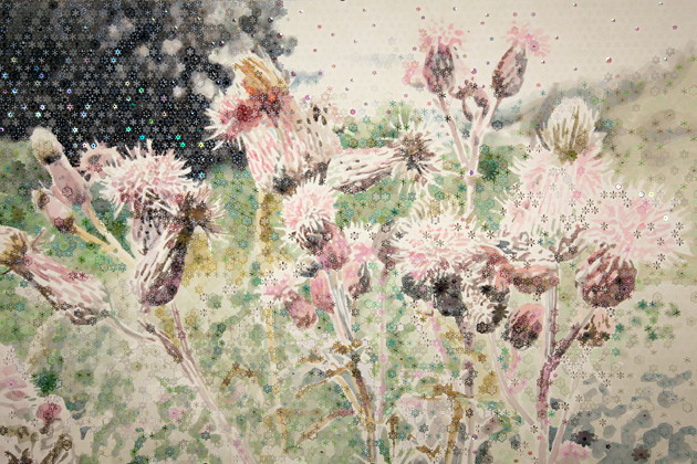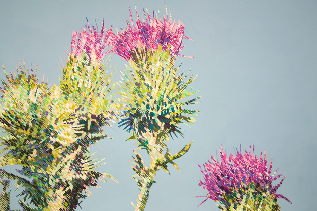 Ripple Rock was a twin peaked underwater mountain located near the town of Campbell River, BC. Nearly twenty large vessels and about one hundred smaller ones fell victim to this treacherous rock before it was destroyed in 1958 by a planned explosion. The explosion created a column of debris that rose nearly 300 meters in height. It was considered a national historic event and was broadcast live on CBC Television. This piece documents some thistles growing on the side of the highway near the plaque that commemorates the event.