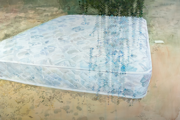 One Hundred Drawings is a series of works done in watercolour on paper with overlays of screenprint, gouache. Some have hand-sticthed sequins and beads. Each one depicts a site of disaster that have I have visited and re-photographed. Although the nature and magnitude of each event covered by my project varies considerably throughout the series, all the events have been pictured in the media, simultaneously marking them as historical and thus fostering ongoing attention. In opposition to the spectacle triggered by the media coverage of each event, I have focused on the elusive qualities of each site.