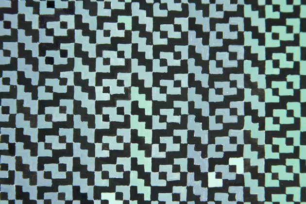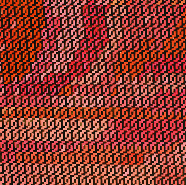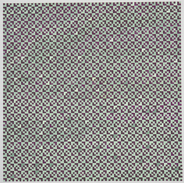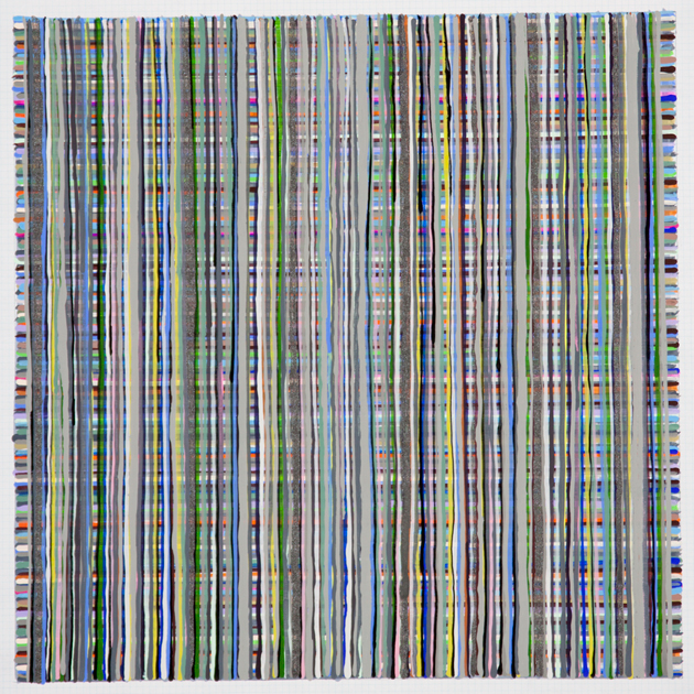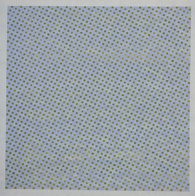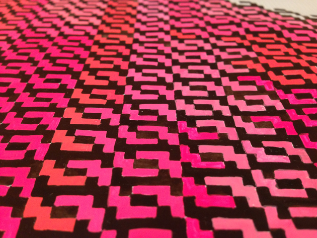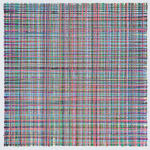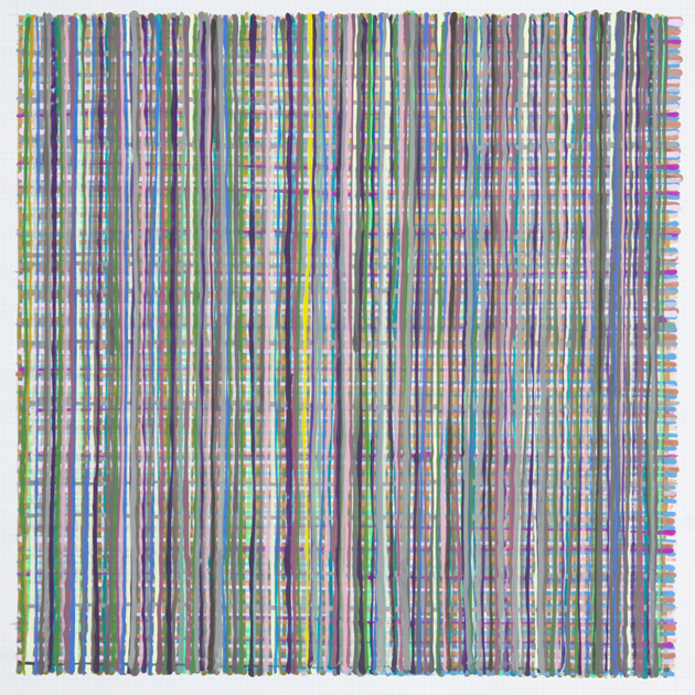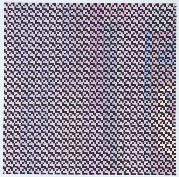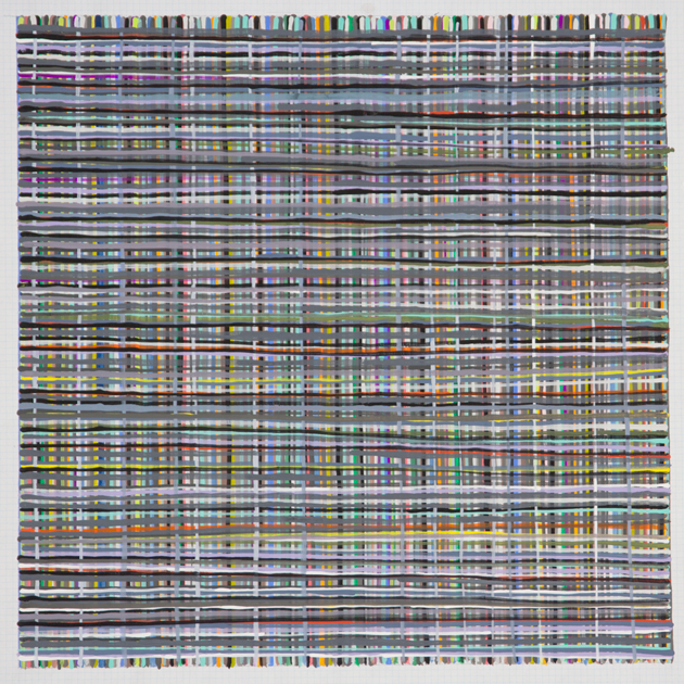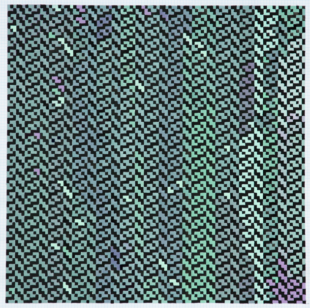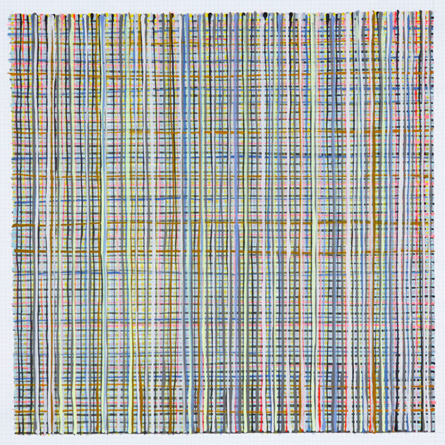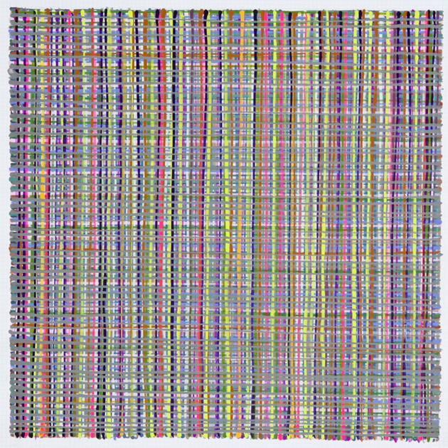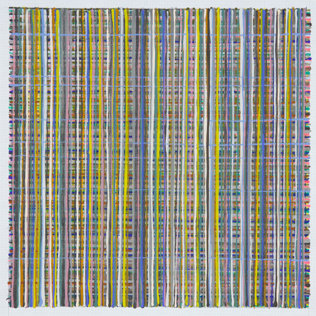 This series of work includes a series of paintings that mimic attributes of woven structures. They are hand-painted in gouache on velumn grid paper.