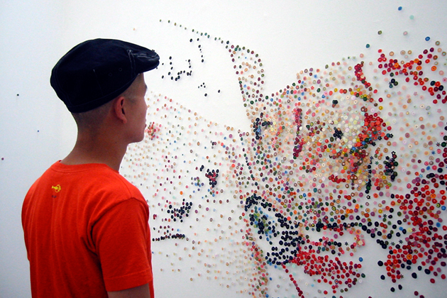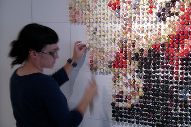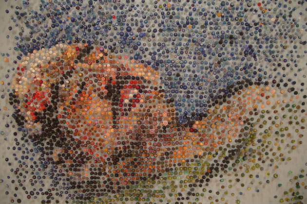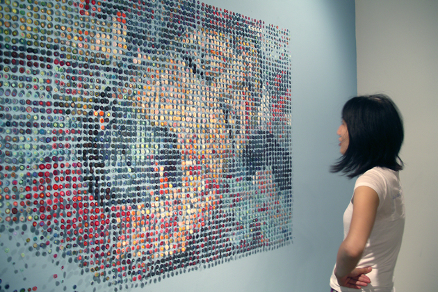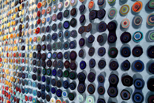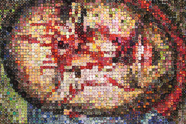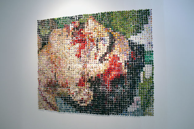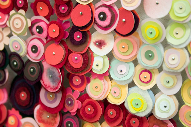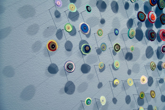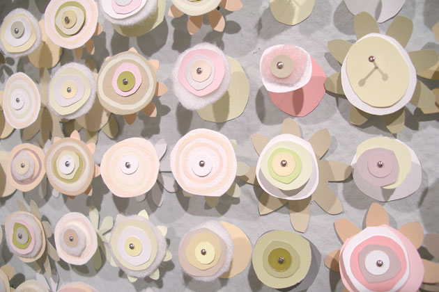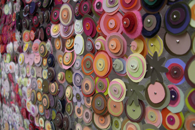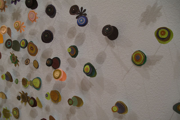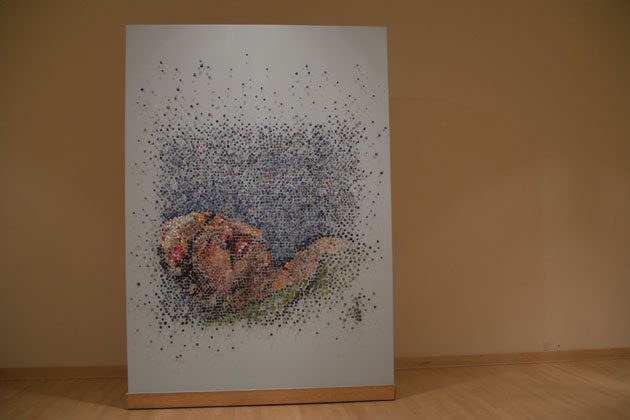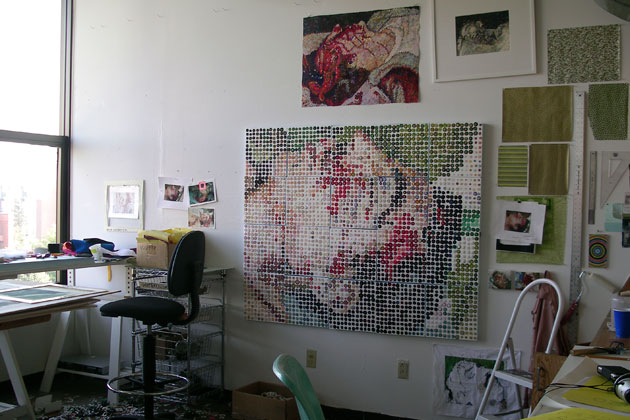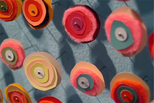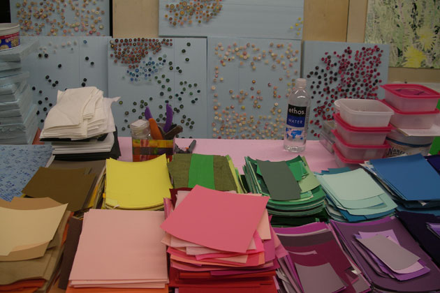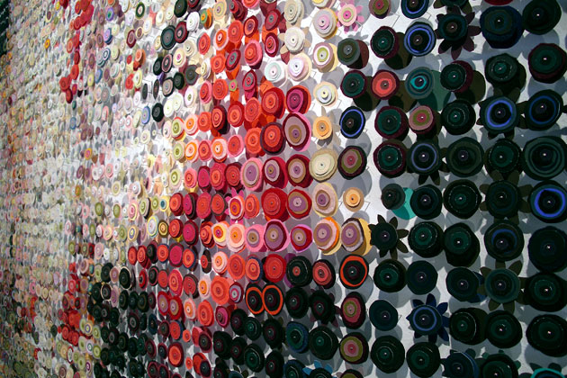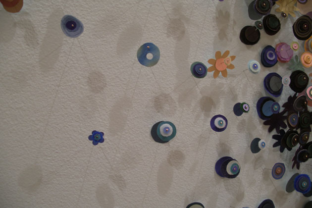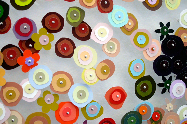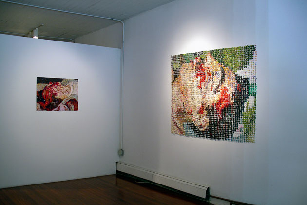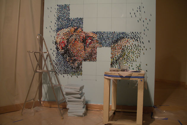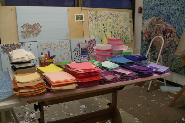 Florescence (Flowers for Iraq) is a series of installation pieces that examine images from the war in Iraq available on Internet sites. In these works, I have attempted to rescue the horrific images from their de-personalized context and imbue them with a sense of beauty. Creating them out of thousands of small, colorful pieces of paper they become memorials to the brutal realities of horrors of war.
