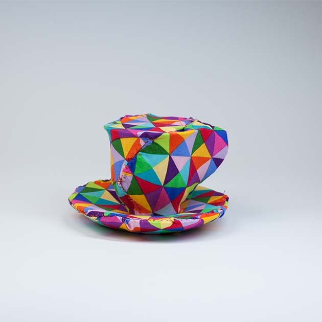 Teacup sewn in colorful cloth, 4x4x4 inches, (destroyed)