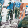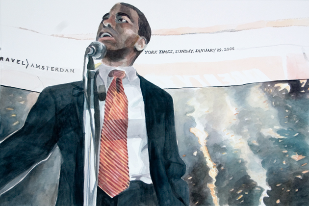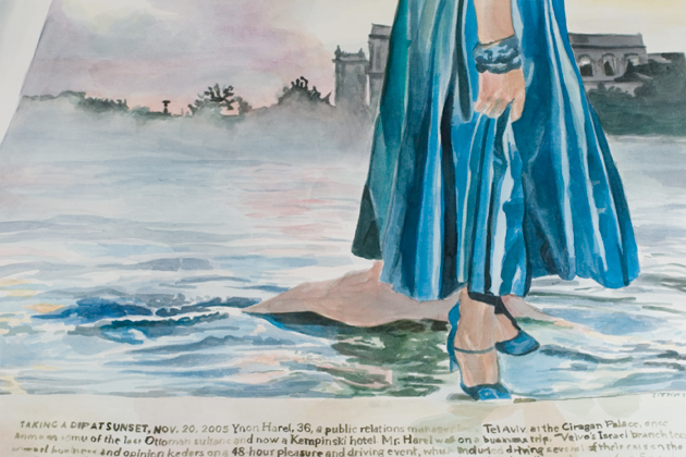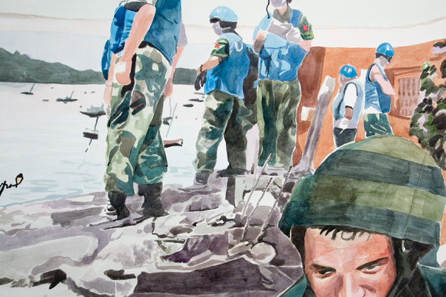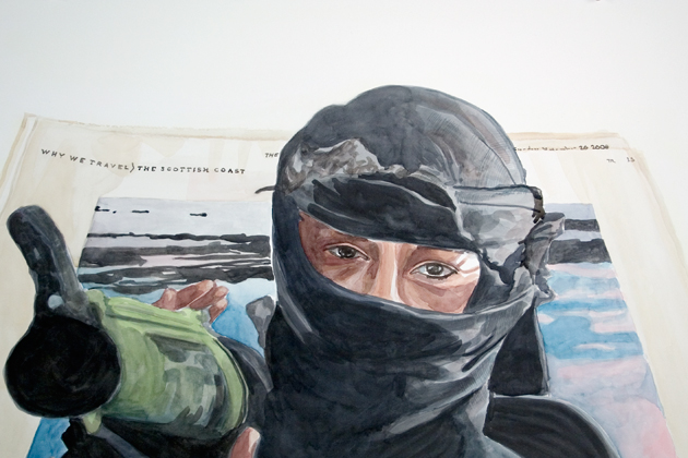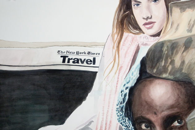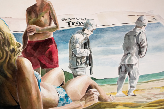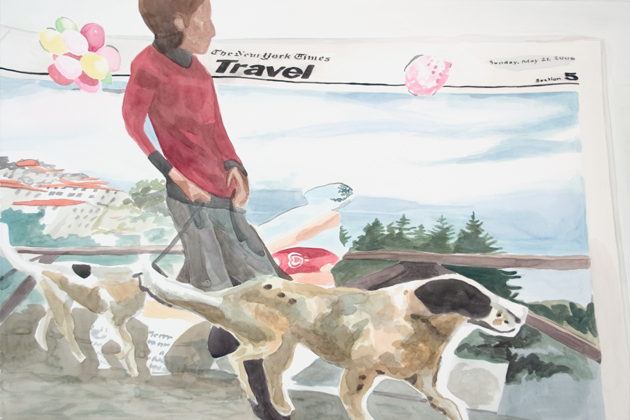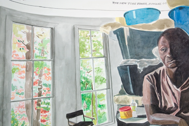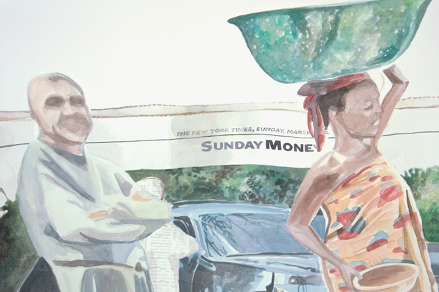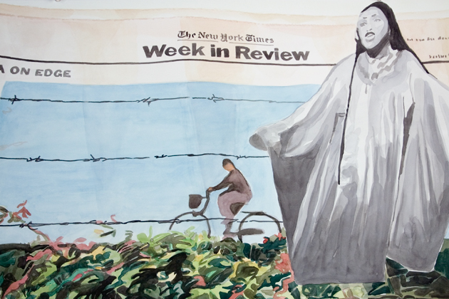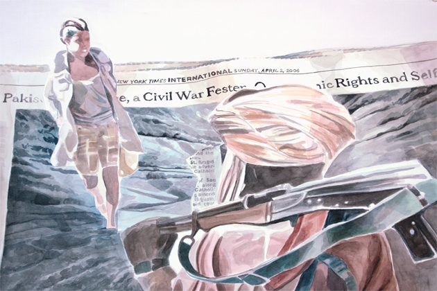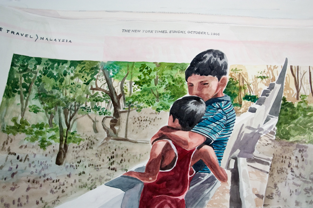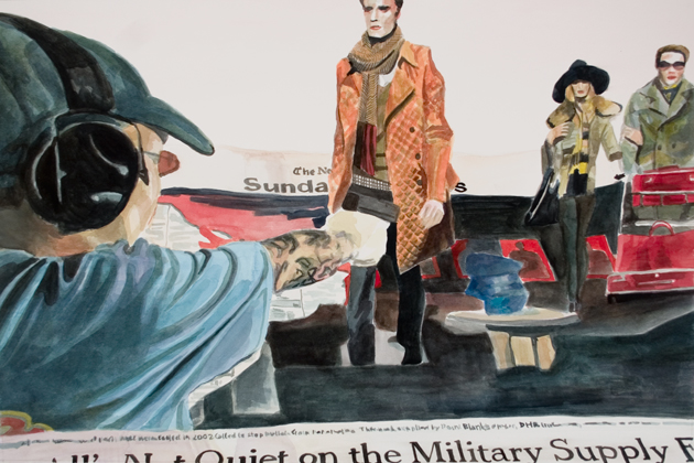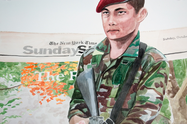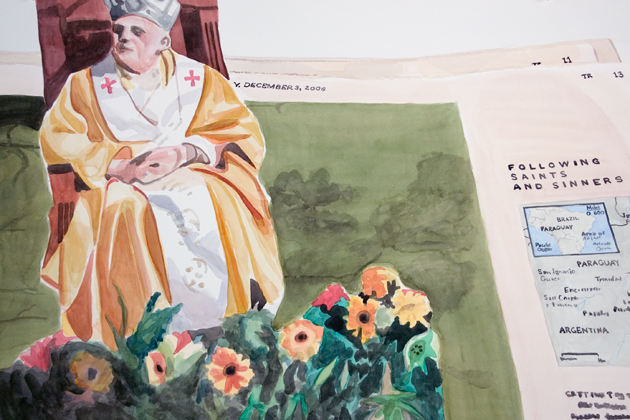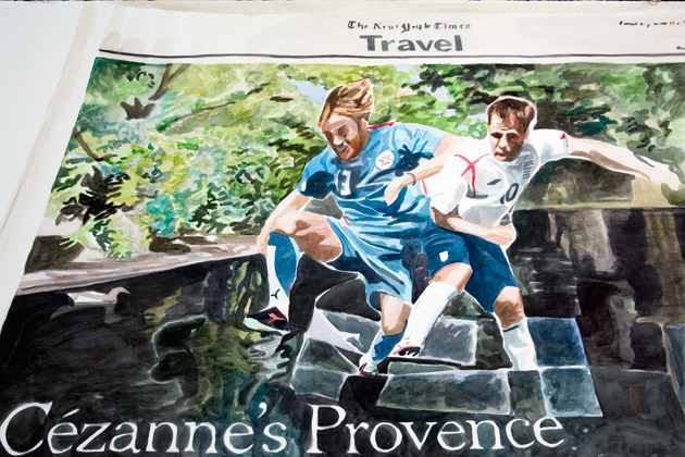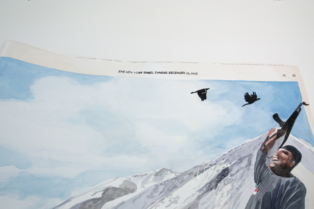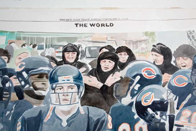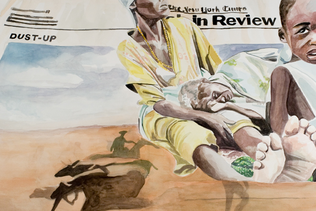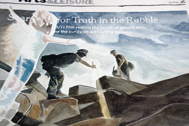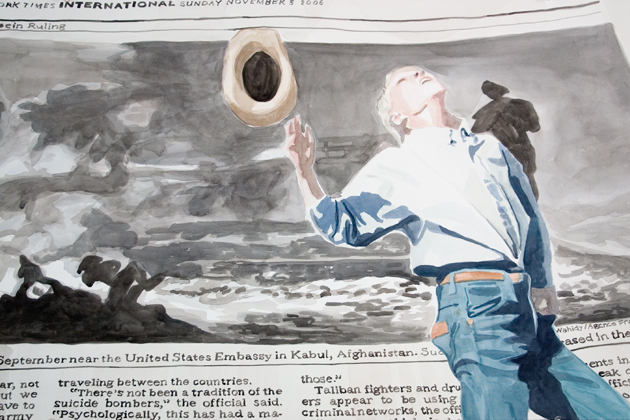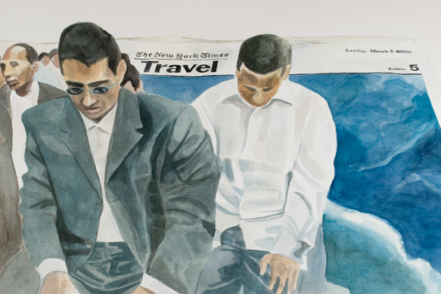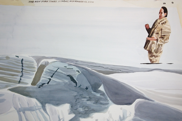 This series of Sunday Paintings consists of 53 watercolor paintings done from sculptural collages of the Sunday New York Times in 2006, between Sunday, January 1 and Sunday, December 31, 2006. The work examines the connection between the realm of leisure and the invasive images that tend to permeate that sphere in our society. The New York Times, as with many contemporary newspapers today, often contains at least one image of a military action, death or some kind of human suffering, yet the Sunday New York Times is associated with leisure due to the fact that its sheer volume promises no swift reading. It is this paradox that I attempt to uncover in this series of paintings documenting the Sundays in 2006.